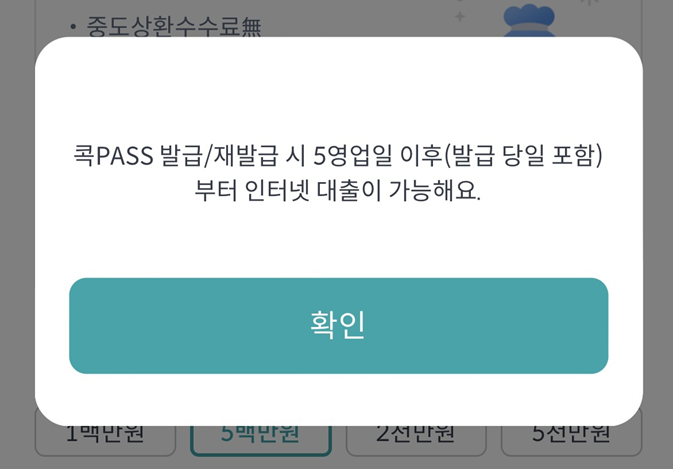 * 참고로 콕PASS 발급/재발급 시 5 영업일 이후(발급 당일 포함)부터 인터넷 대출이 가능하다는 안내 팝업 뜸.