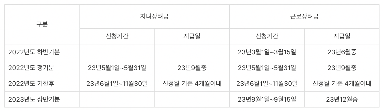 | 구분 | 자녀장려금 | 근로장려금 | ||